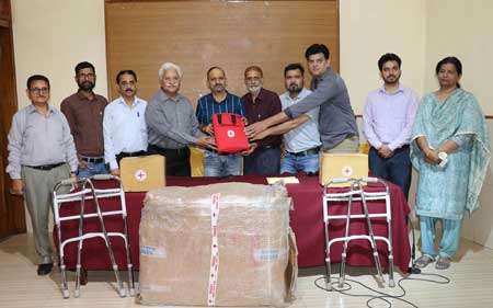 Regional Branch of Indian Red Cross Society Jammu today donated wheel chair, walkers, first aid kit, masks and sanitizers to Press Club of Jammu.