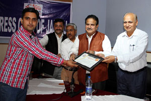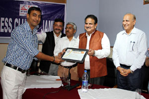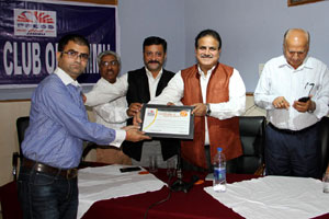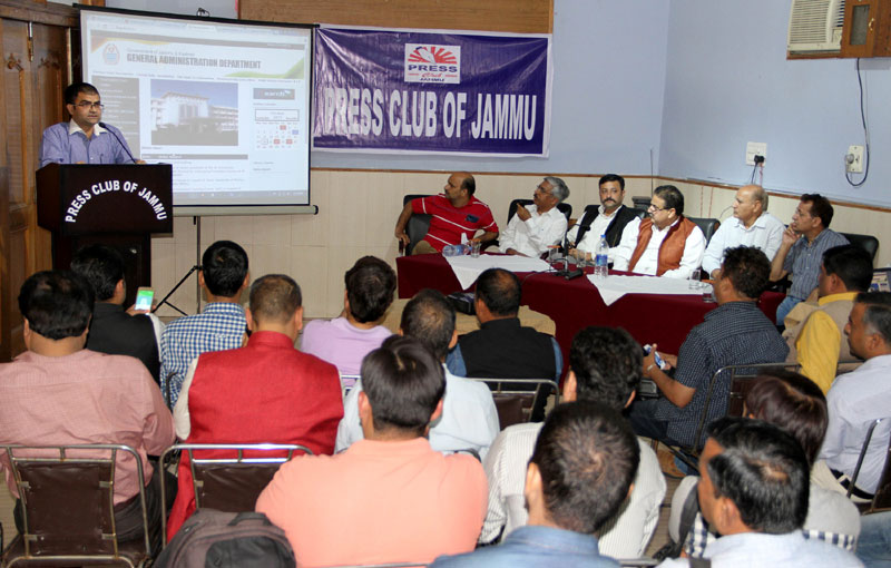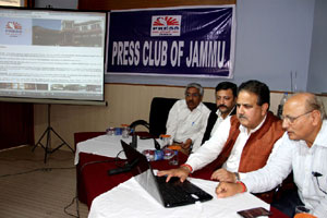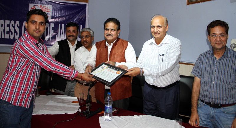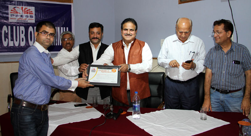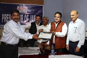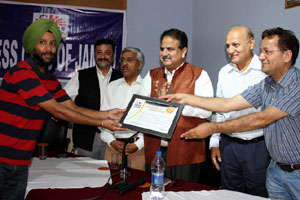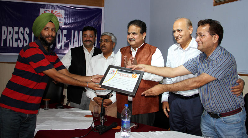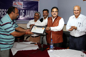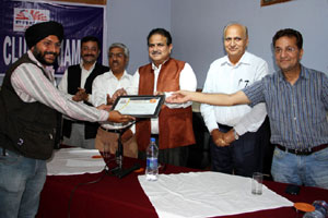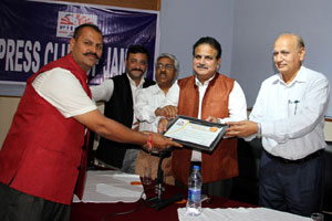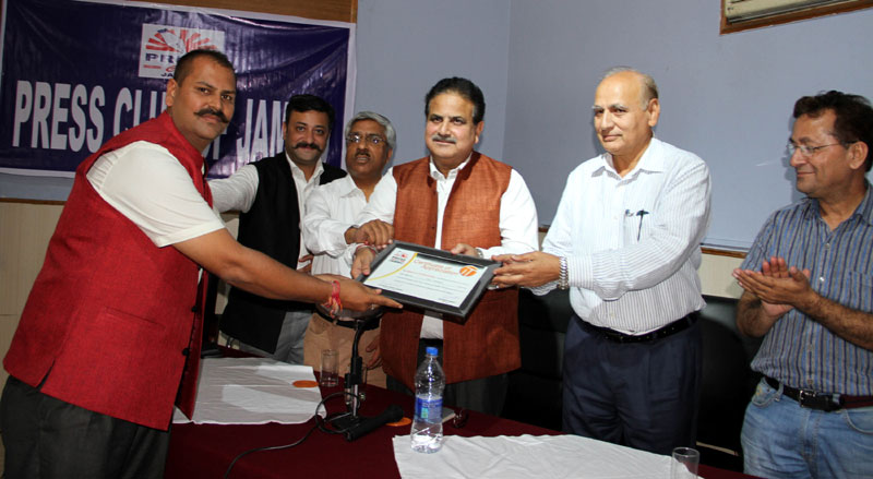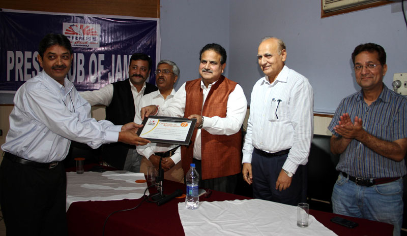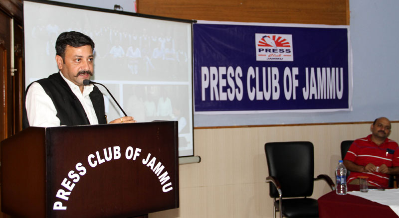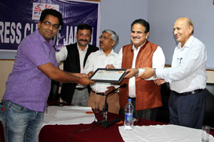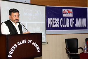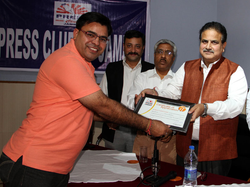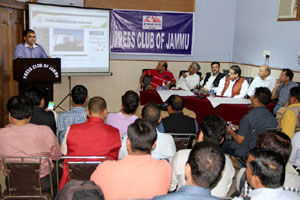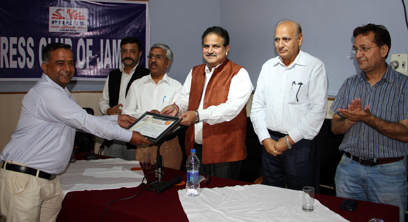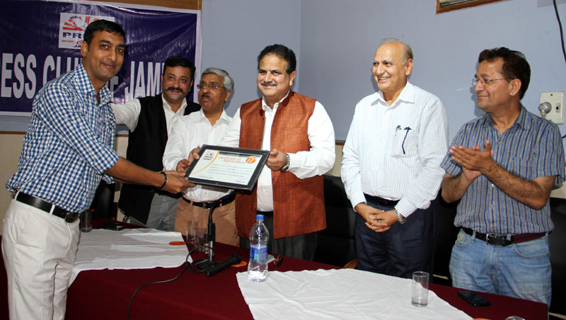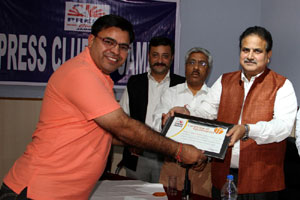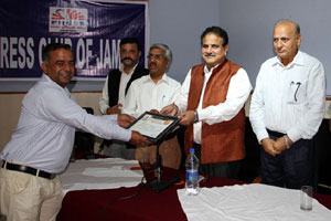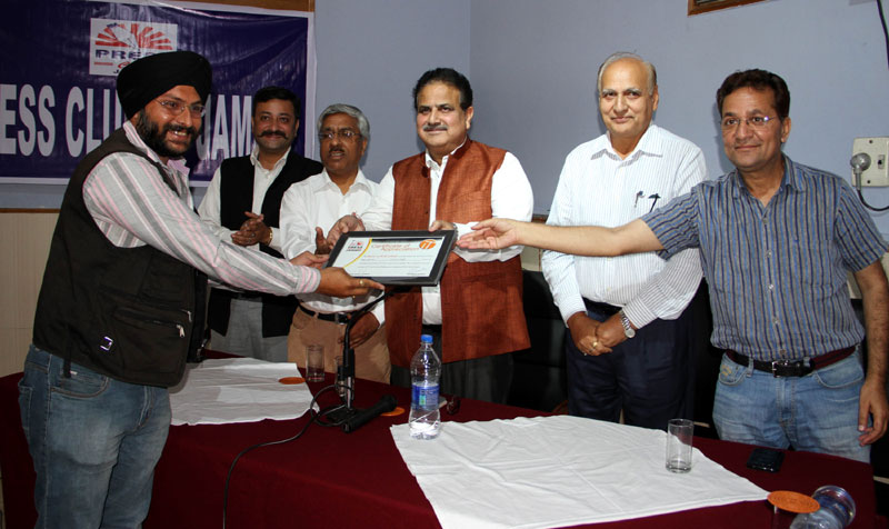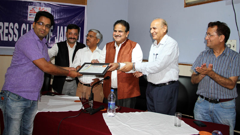 Press Club of Jammu vice president Abhimanyu Sharma, secretary general, Zorawar Singh Jamwal, Finance Secretary, Dinesh Manhotra and Sanjit Khajuria, Assistant Director, Doordarshan, also shared the dais.